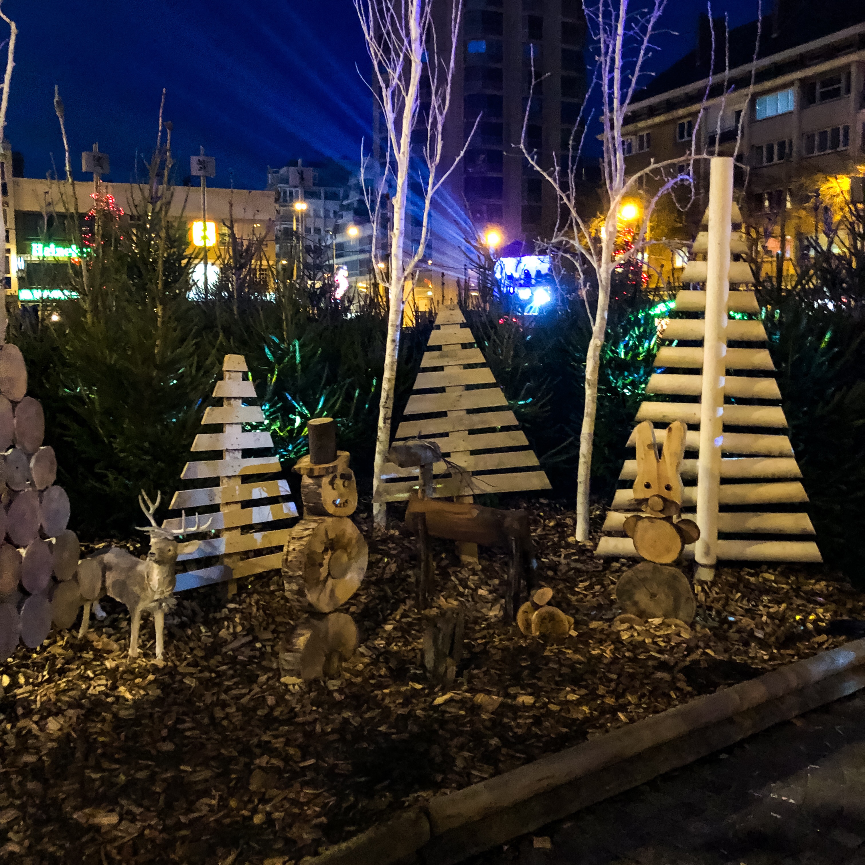 With only a handful of stalls (definitely not the 50 advertised on the facebook page), we were a little disappointed, so we decided to continue to wander through town. Strolling down the street with our mulled wine we stopped here and there to gaze upon buildings erected hundreds of years ago, memorials to those lost in WWII and take fun photos in a new modern mirrored bus stop. Not too many blocks down the road, we ended up at the Dunkirk Town Hall which had been turned into Santa’s house or “La Chateau du Pere Noel.” A temporary pine tree forest took up the square in front of the town hall providing an opportunity to take a pleasant stroll through the trees all while peeking into different scenes in Santa’s workshop. The path ended at the town hall’s open front doors, a crimson carpet leading up the stairs to where, I assume Santa sat, still seeing children, even the day after Christmas. (Is this a mash of up Santa comes on Christmas day tradition and the three kings who bring gifts on the Epiphany tradition? Can someone tell me? French readers?)